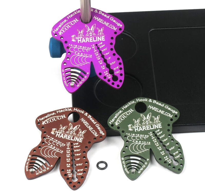 The Hareline Hackle, Hook, & Bead Gauge was designed to be the ultimate accessory for your fly tying vise. Simply slide the gauge onto the stem of your vise and you will have the ability to measure hackle, hook, and bead sizes within a matter of seconds. This beautifully designed gauge is made of anodized aluminum and is available in your choice of 3 popular colors. A must have tool for all fly tiers!