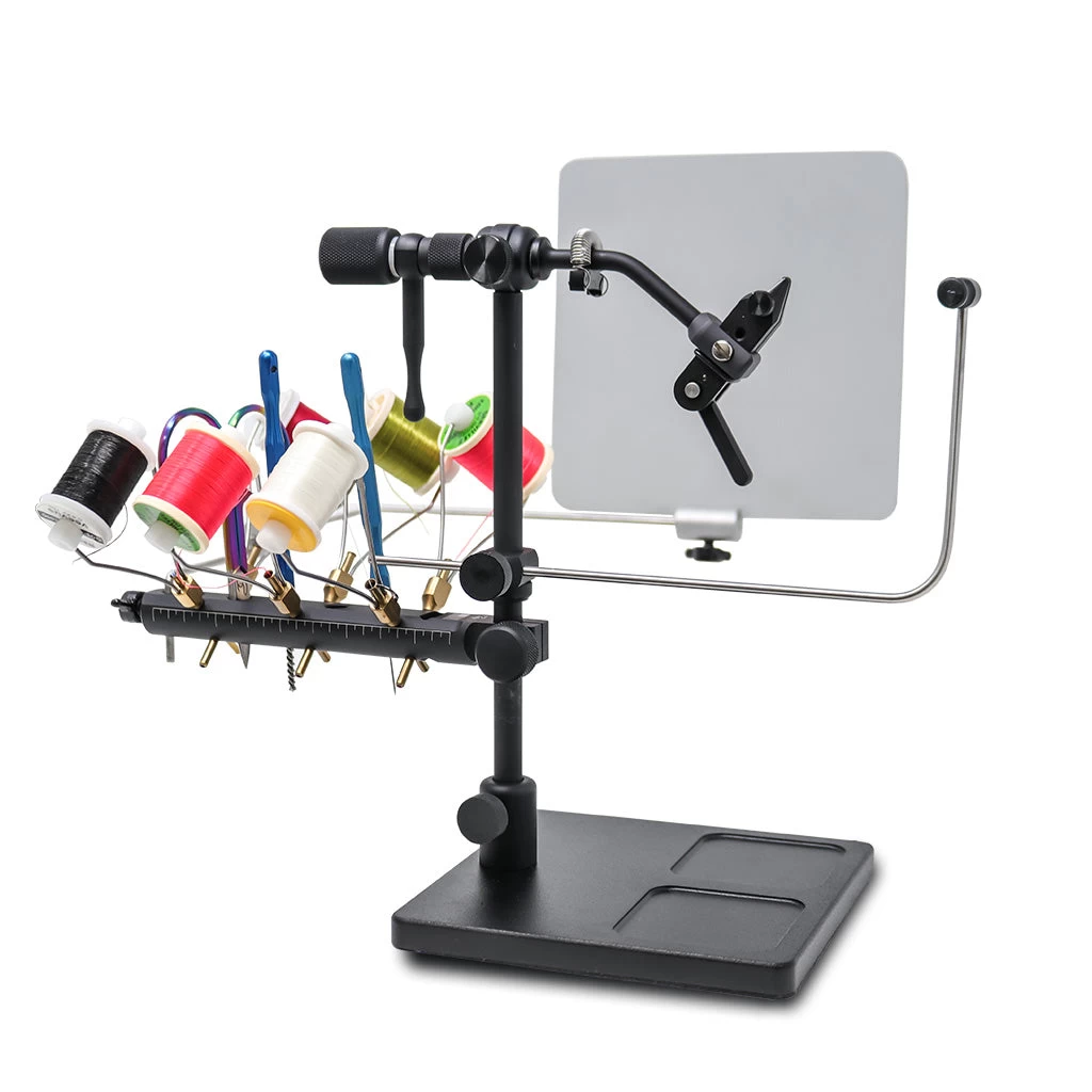 A great tool organizer, designed to hold a number of fly-tying hand tools including scissors, and an Enhancement Plate. It is made out of aluminum and will fit any 3/8 stem. Its locking mechanism is superior to any toolbar on the market. It comes in 2 sizes and a number of colors to customize your vise.